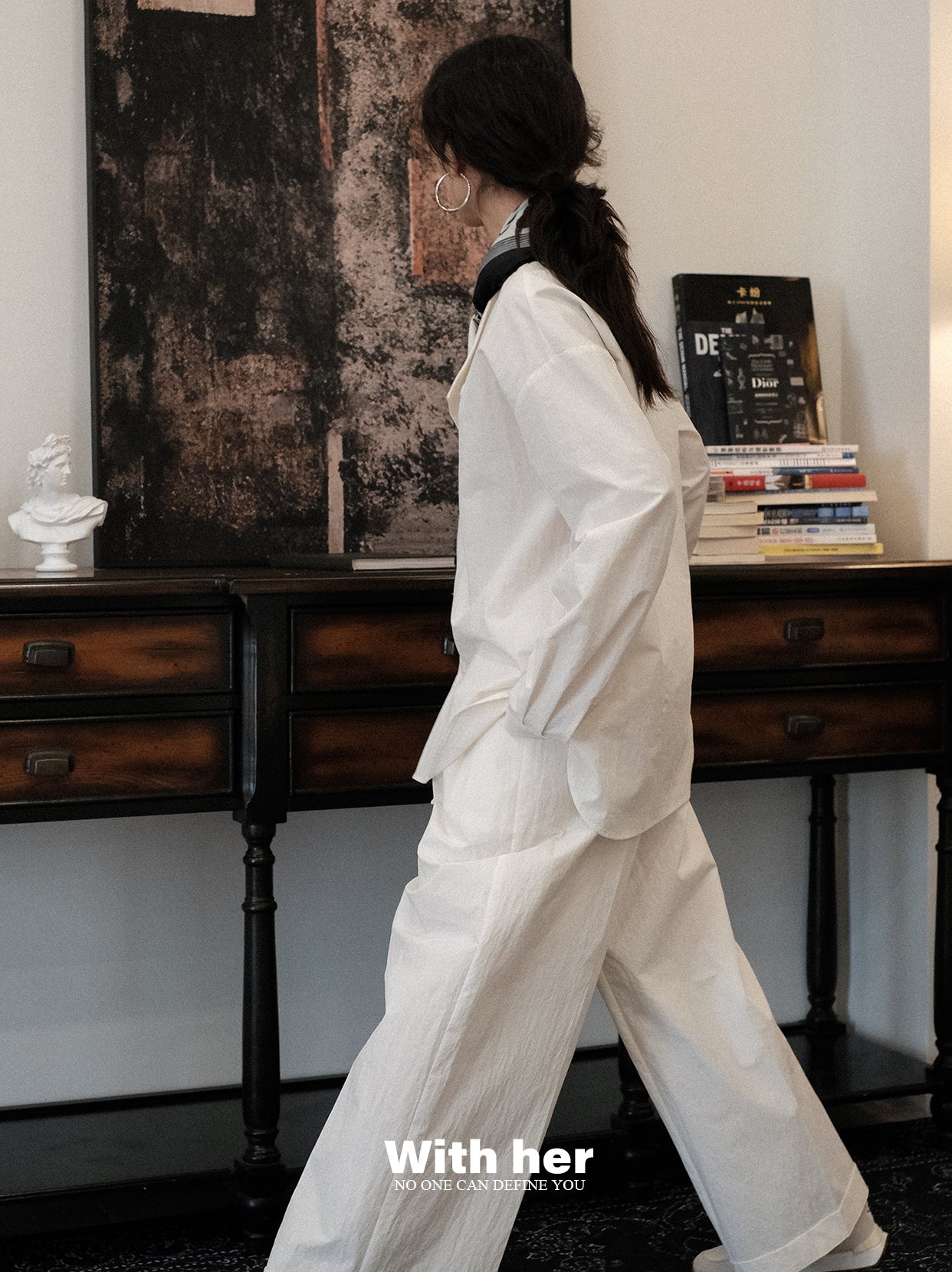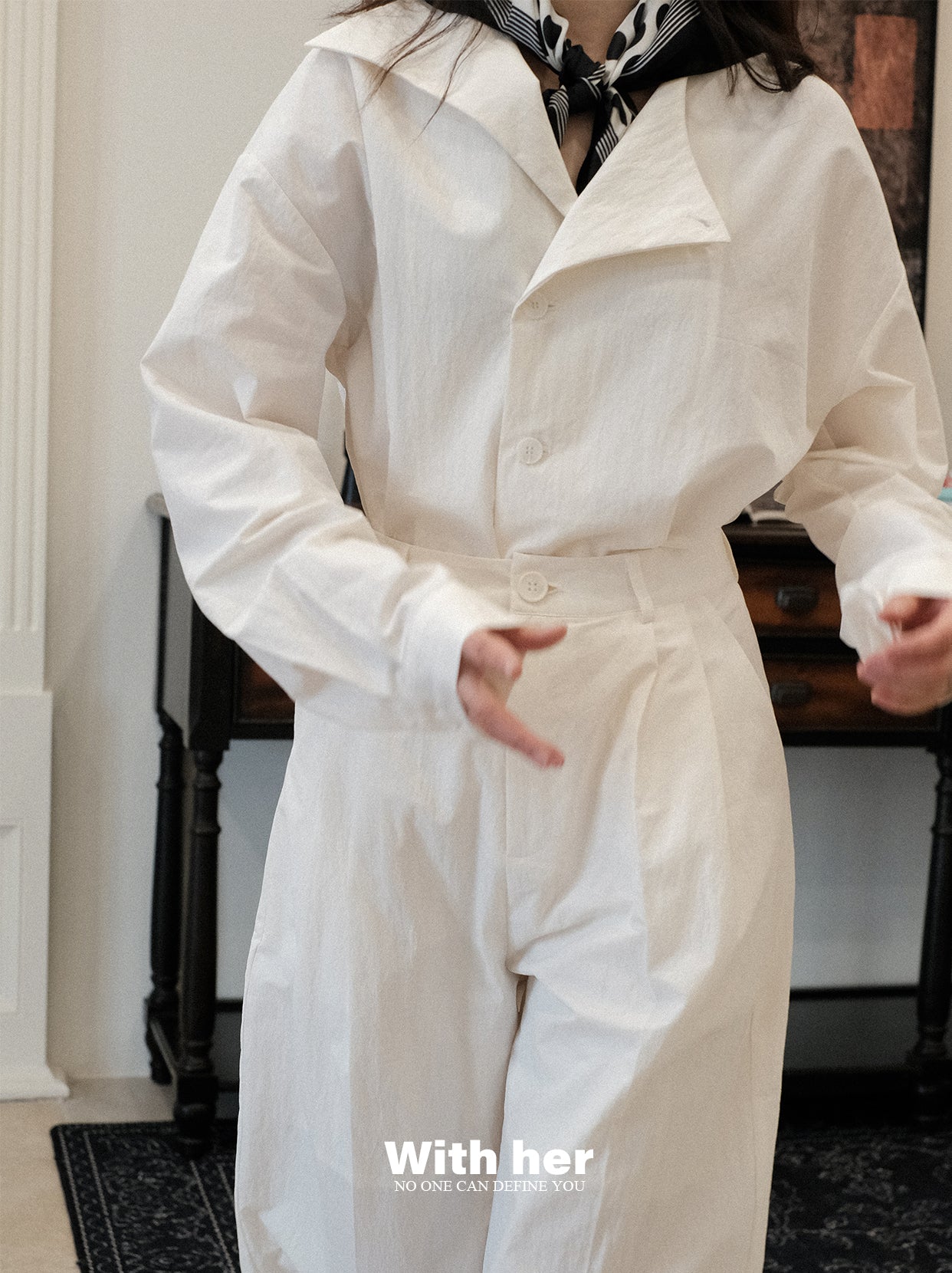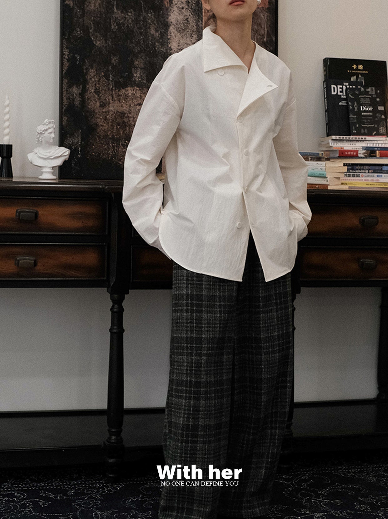 刚好在夕阳的剪影下,设计出的一款衬衣。选用了带点斑驳肌理感的棉锦面料,上身骨感有型,质感独特,整体版型宽松而不宽大,随性自然。