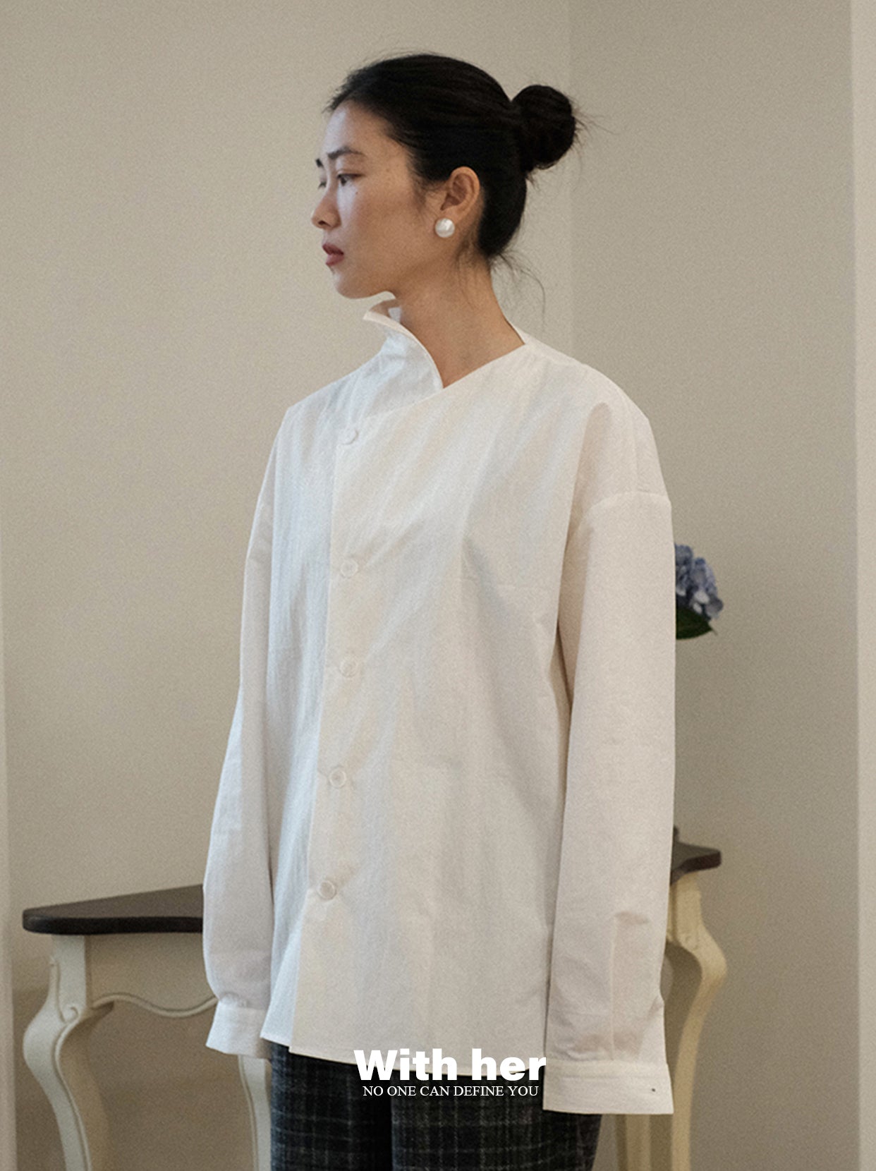 Capture the silhouette of a sunset. This shirt is made from a cotton-silk fabric with a subtly textured finish. The fit is structured yet effortlessly flattering, offering a unique, bone-structured feel. The overall silhouette is relaxed, yet never oversized, exuding a natural, laid-back elegance.